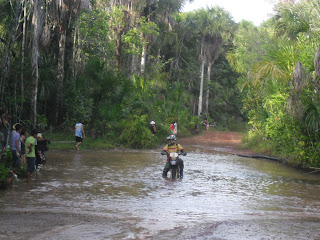 Nesse trecho o joaninha pegou uma vaca numa curva com areia. Na travessia do igarapé quase a moto estanca bem no meio, mas consegui atravessar sem maiores problemas; o Erlo estancou a moto no meio do Igarapé e o joaninha perdeu a flauta e o bocal do escape nesse bendito igarapé. deu um pouco de trabalho fazer a moto do Erlo pegar, mas conseguimos.